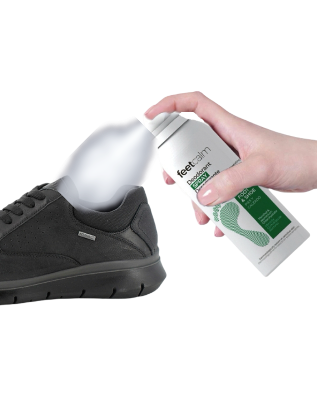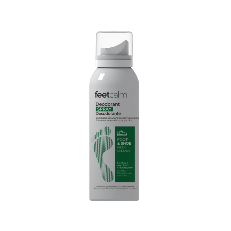Feetcalm Deodorant Spray är en deodorantspray för fötter och skor, framtagen för att minska svettning och omedelbart ta bort dålig lukt. Med aktiva ingredienser som mentol och aluminiumklorhydrat hjälper den till att hålla fötterna torra och fräscha hela dagen. Sprayen absorberas omedelbart och lämnar ingen fet känsla, vilket gör att du kan ta på dig skorna direkt efter applicering. Produkten är dermatologiskt testad och passar även känslig hud.