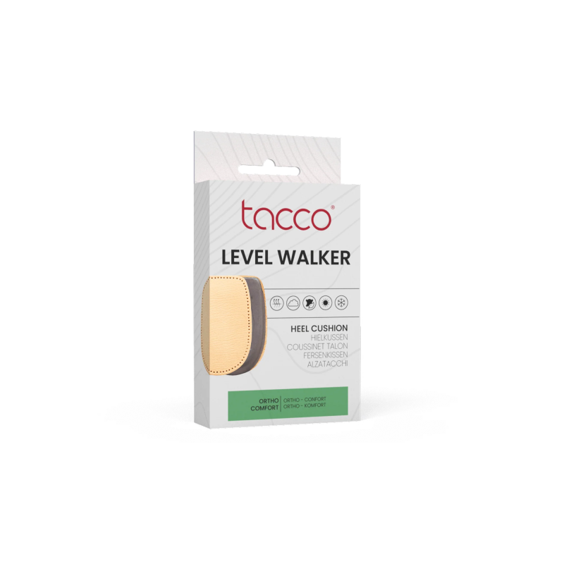 Tacco Level är ett par snedställda hälkuddar som används för att korrigera felställningar i foten genom att höja in- eller utsidan av hälen. Kudden har en ovansida i ekologiskt behandlat fårskinn och en stötdämpande RelaxFlex-funktion för ökad komfort. Självhäftande baksida gör dem enkla att applicera i skon.