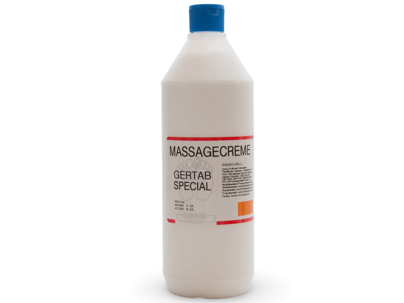 En mycket dryg massagekräm utvecklad av Gertab för kropp och fötter. Krämen innehåller en unik kombination av renade vegetabiliska oljor och örtextrakt som ger en behaglig känsla under behandlingen och bidrar till hudens återfuktning och mjukhet. Formulan ger ett lagom glid, utan att kännas kladdig. Passar bra för både längre och kortare behandlingar.