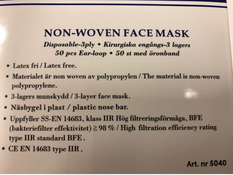 - Typ IIR, CE-märkt: Uppfyller SS-EN 14683, klass IIR med BFE ≥ 98 %