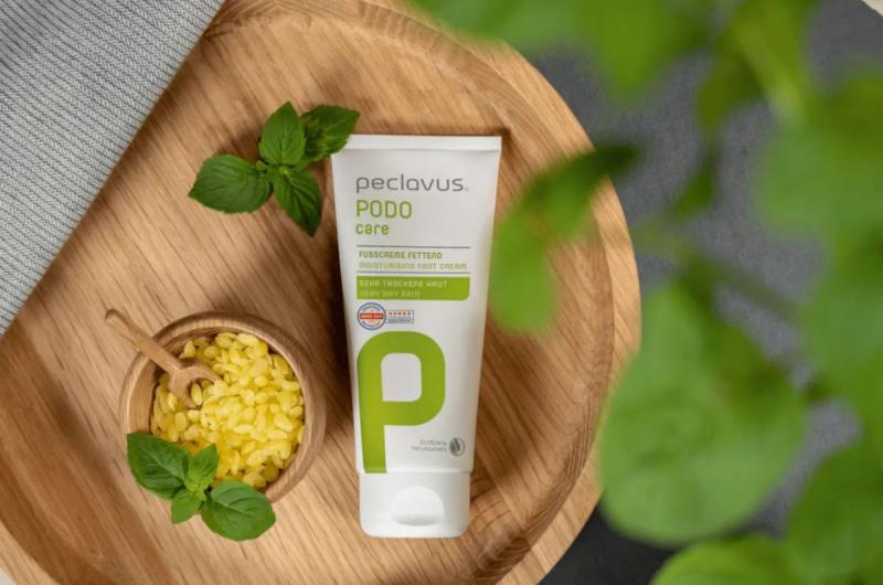 Rik fotkräm från Peclavus för vård av torr, sprucken och förhårdnad hud. Lämplig för daglig användning inom professionell fotvård.