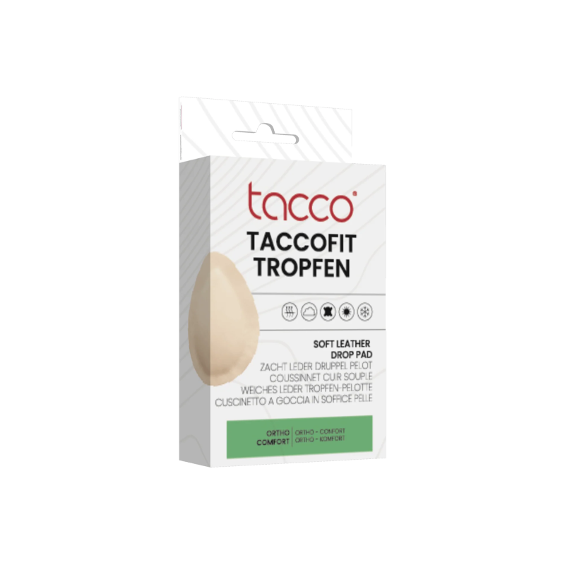 Taccofit 607 är en droppformad pelott med RelaxFlex-funktion och ovansida i ekologiskt behandlat kalvskinn. Den är särskilt utvecklad för att ge stöd åt främre fotvalvet vid platt- och spretfot, och bidrar till att förebygga trötthet i framfoten. Pelottens ergonomiska form och dämpande egenskaper gör den idealisk för dagligt bruk i de flesta skotyper.