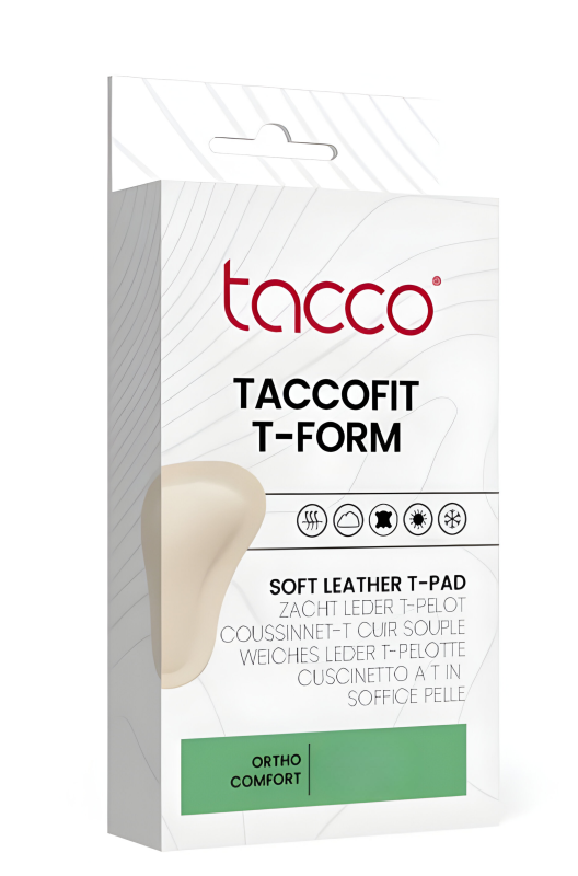 Taccofit 608 är en T-formad pelott med RelaxFlex-funktion, designad för att ge effektivt stöd åt det främre fotvalvet. Pelotten rekommenderas vid plattfot och spretfot, där den lindrar trötthet, avlastar belastningspunkter och ger bekväm dämpning i framfoten. Ovansidan är tillverkad i ekologiskt behandlat kalvskinn som andas och känns behaglig mot huden.