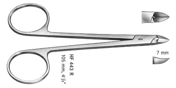Aesculap HF443R är en 102 mm lång tysktillverkad nypsax, utformad för precis och skonsam borttagning av hudrester och förhårdnader. De inåt-vinklade raka bladen ger hög precision och god åtkomst även på svåråtkomliga områden.