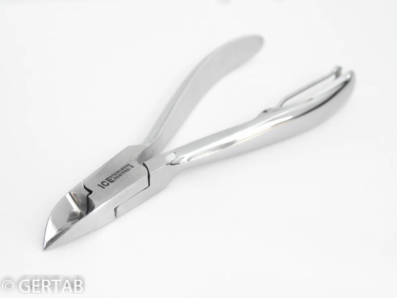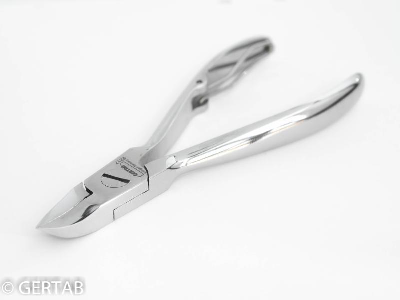 Nageltång i rostfritt stål med böjda blad och enkel trådfjäder. Anpassad för nageltrång. Hög tysk kvalitet.