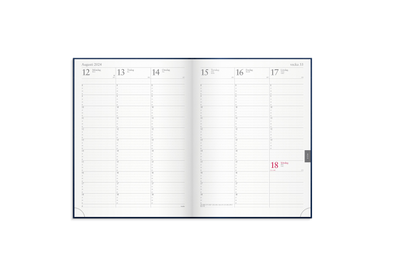 En vecka per uppslag gör det enkelt att få en snabb överblick över planerade möten och uppgifter.